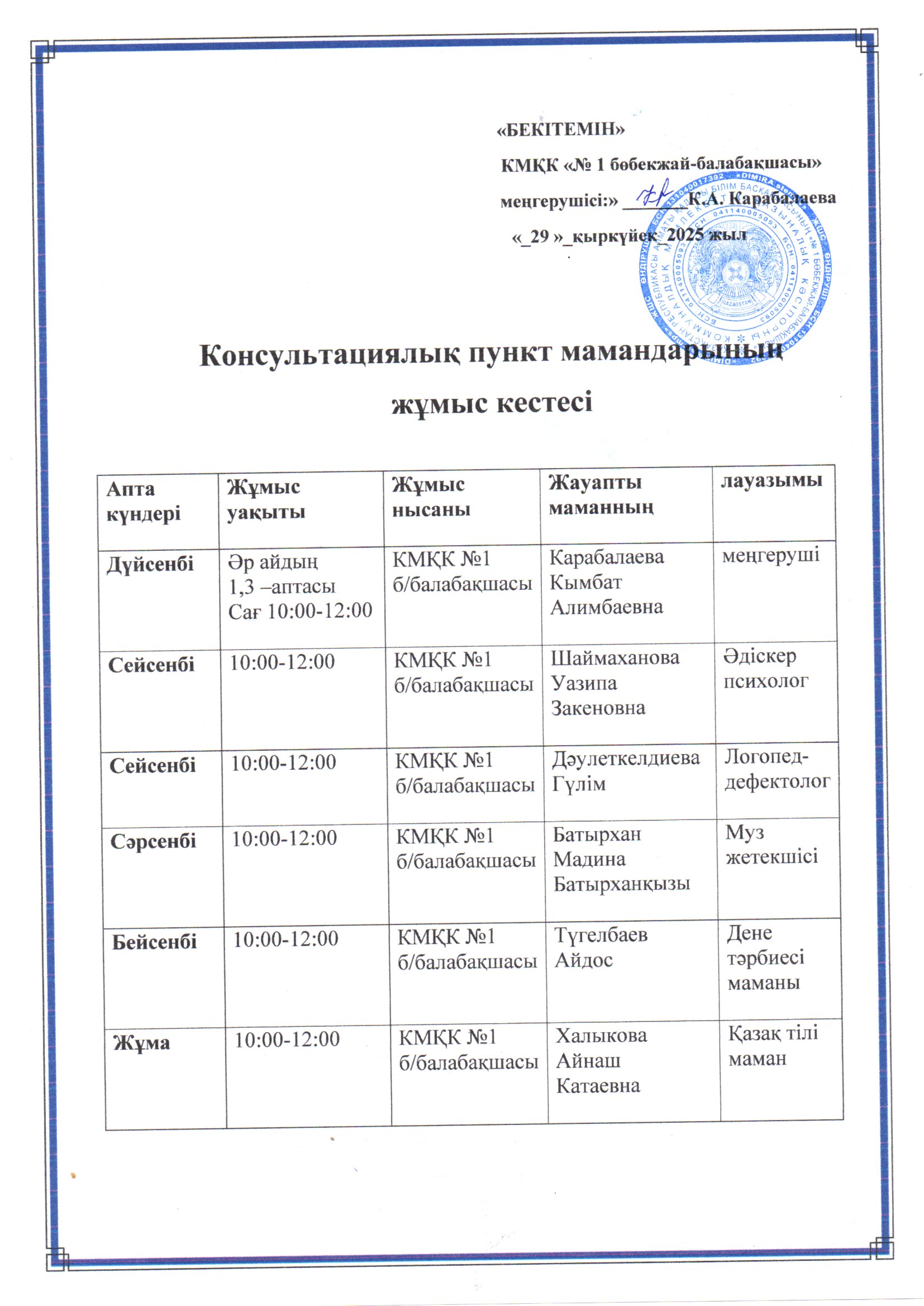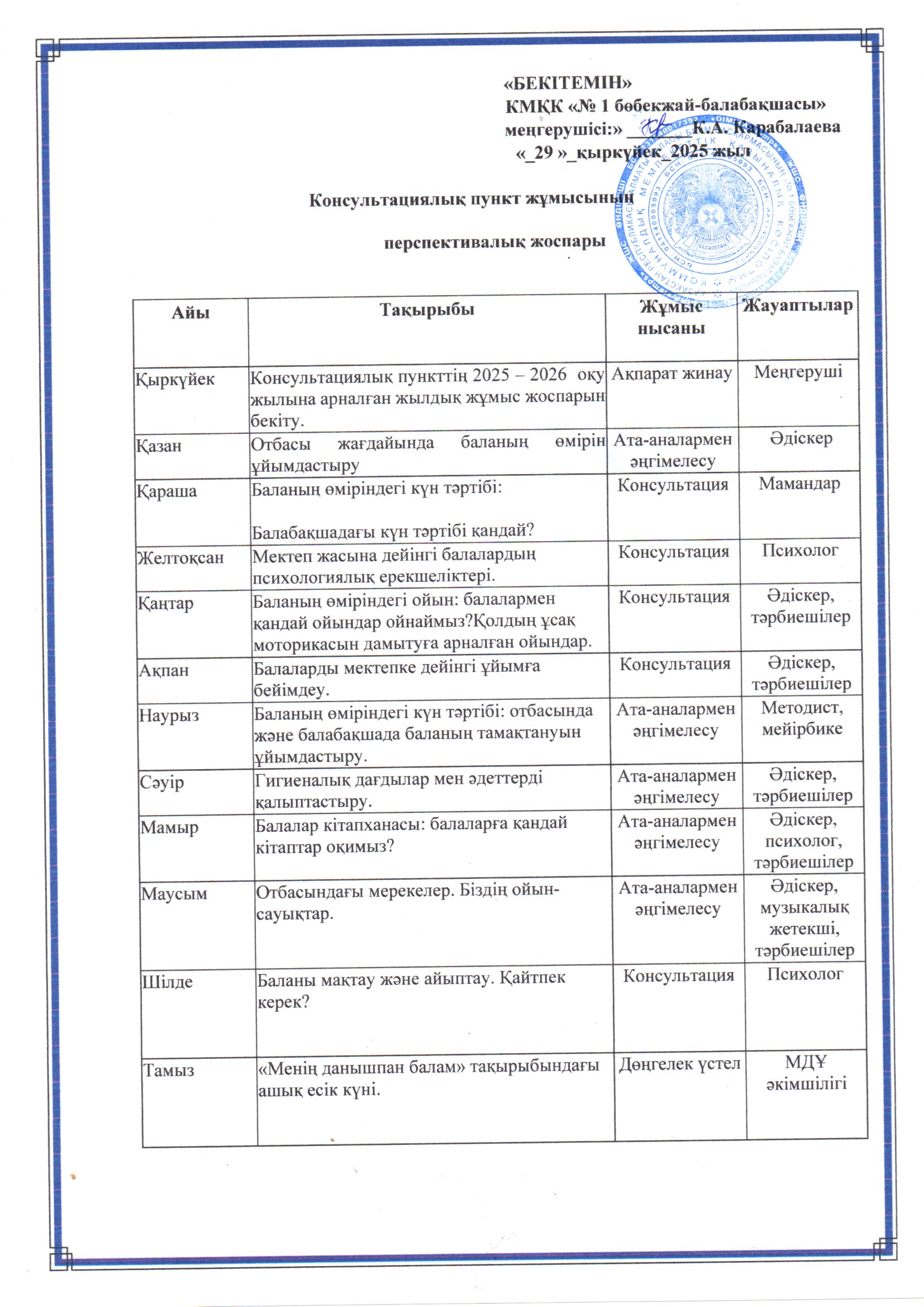 Консультациялық пункт 25-26 жылғы жұмыс жоспары » ГККП "Ясли-сад №1". Алатауский район