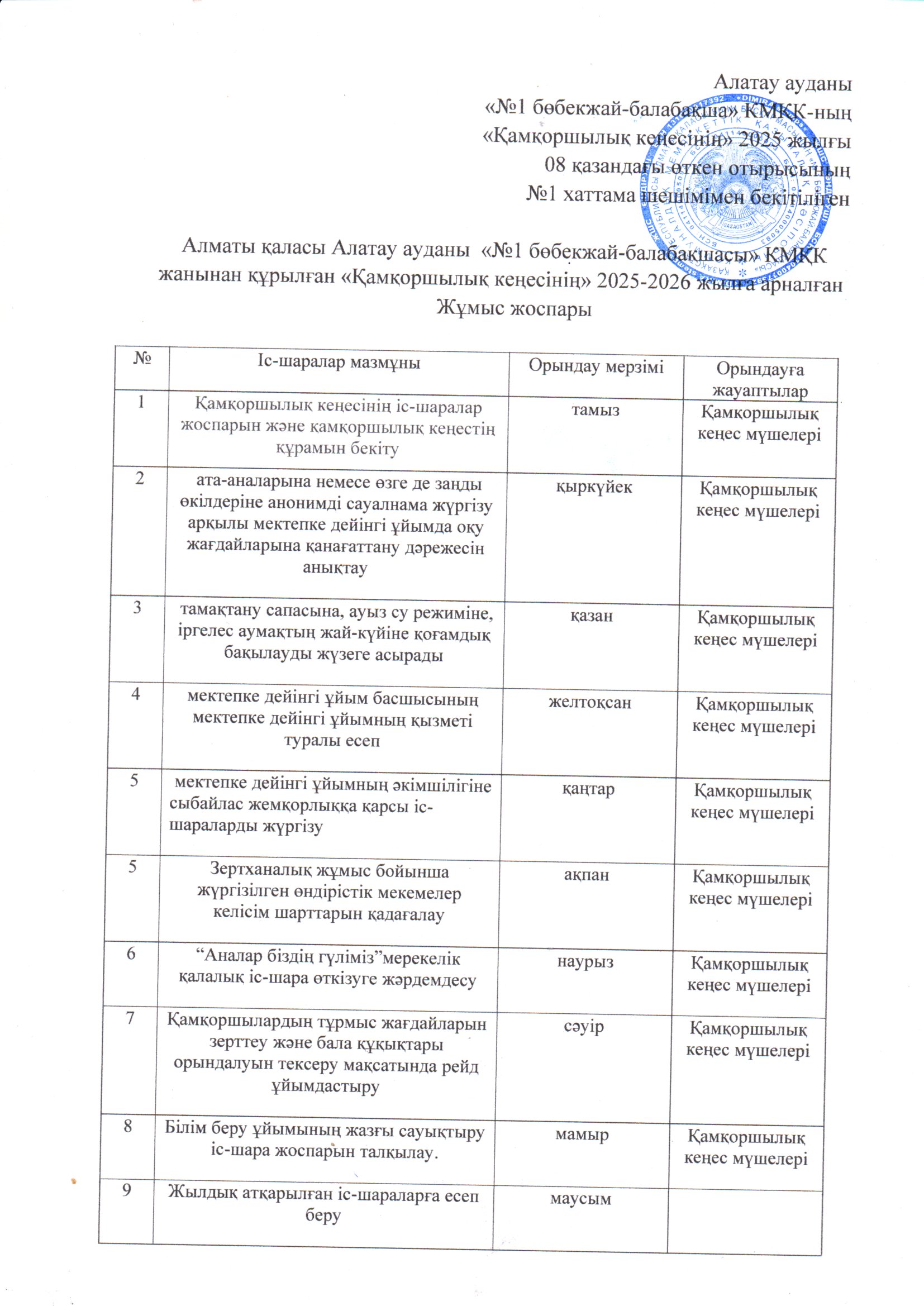 Қамқоршылық кеңес жоспары » ГККП "Ясли-сад №1". Алатауский район